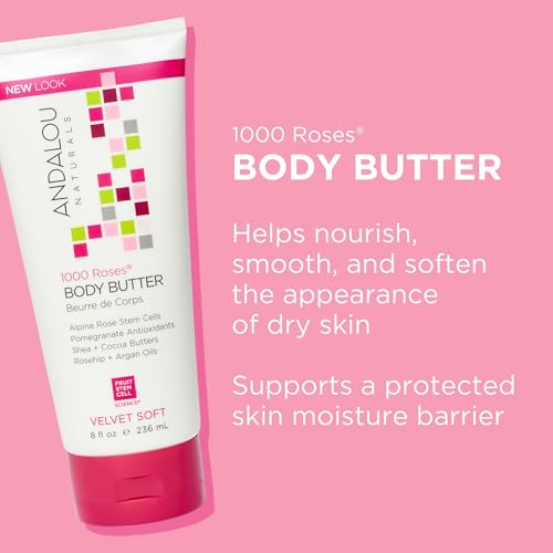 Andalou Naturals Velvet soft 1000 Roses body butter, this velvety soft body butter blends skin soothing rosewater with shea and cocoa butters to smooth and soften dry skin. Rosehips and Argan oils, rose stem cells, pomegranate, and superfruit antioxidants effectively nourish and stimulate healthy cell renewal for an all over body treatment. Fruit Stem Cell Science renews skin at the cellular level, blending nature and knowledge for healthy radiance and vitality.