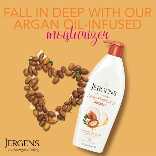 Jergens Deep Restoring Argan Oil Moisturizer, Soothing Body and Hand Lotion with Reviving Argan Oil and Vitamin E, Oil-Infused, Dermatologist Tested, 16.8 oz