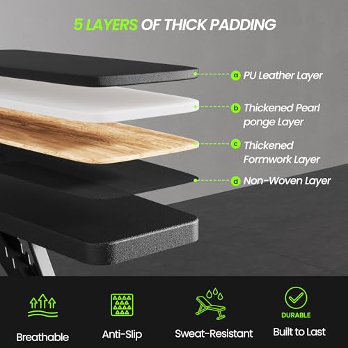 COMFORTABLE MATERIAL – The surface of weight bench is made of breathable leather, which is sweat-proof, anti-slip and easy to clean. High-quality & Eco-friendly foam padding to reduce muscle fatigue. Foldable weight bench is an ideal choice for home and gym