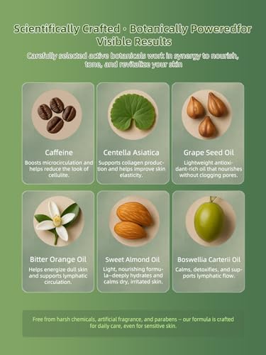 4-in-1 Botanical Formula – Smooth, Detox, Firm, Nourish: Powered by caffeine, centella asiatica, bitter orange oil, and a blend of nourishing carrier oils, this multi-action formula helps reduce cellulite, support lymphatic flow, tighten skin, and deeply hydrate.
